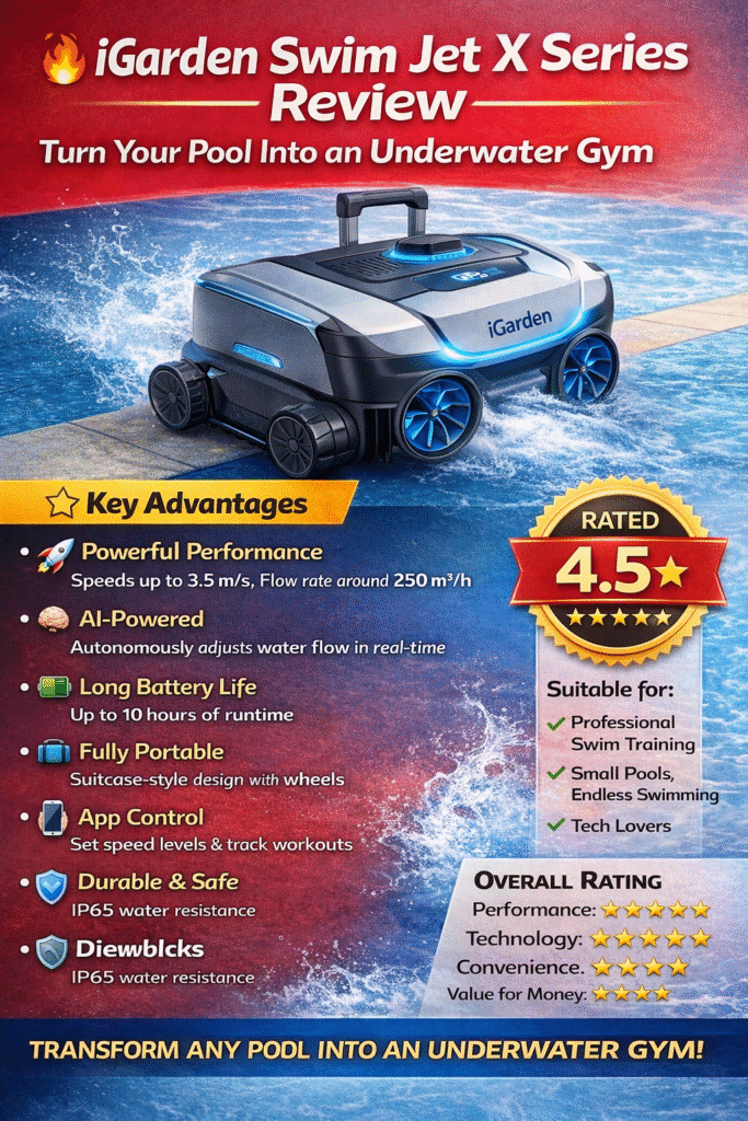 The iGarden Swim Jet X Series is a powerful swim jet system designed to create a strong water current, allowing you to swim in place—just like an endless pool. What makes it stand out is its portable design + AI-powered technology, eliminating the need for expensive permanent installations.