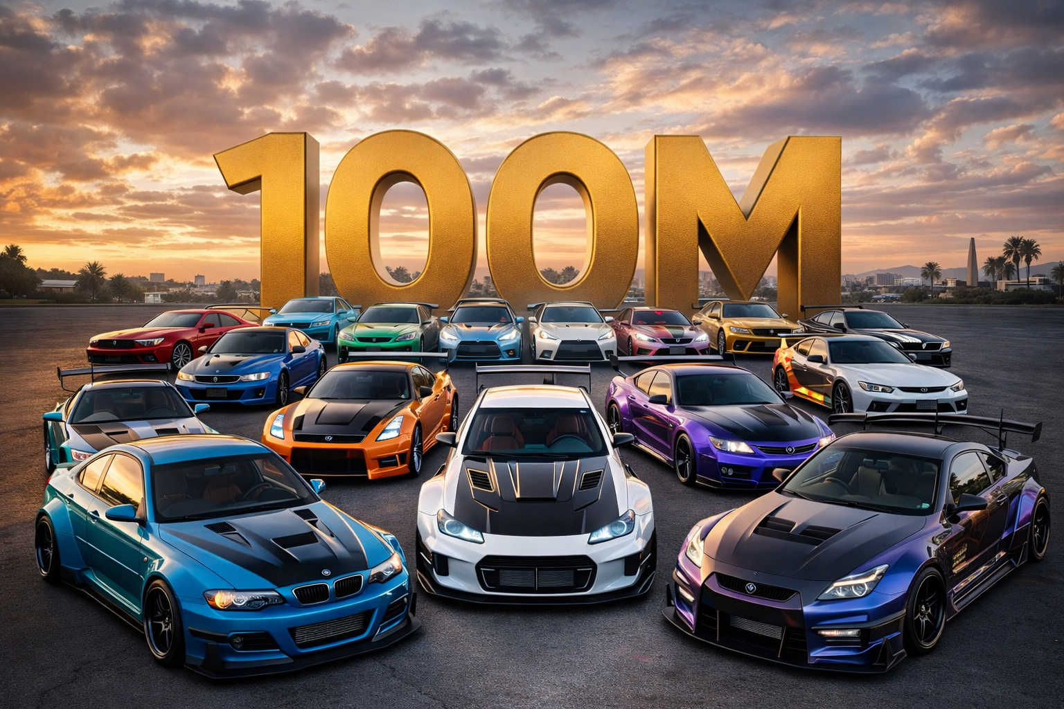 The composition of the scene is equally impressive. The bold “100M” centerpiece symbolizes achievement and scale, while the carefully arranged lineup creates a sense of unity among the diverse builds. Lighting and background further elevate the presentation, giving it a cinematic, almost promotional feel.