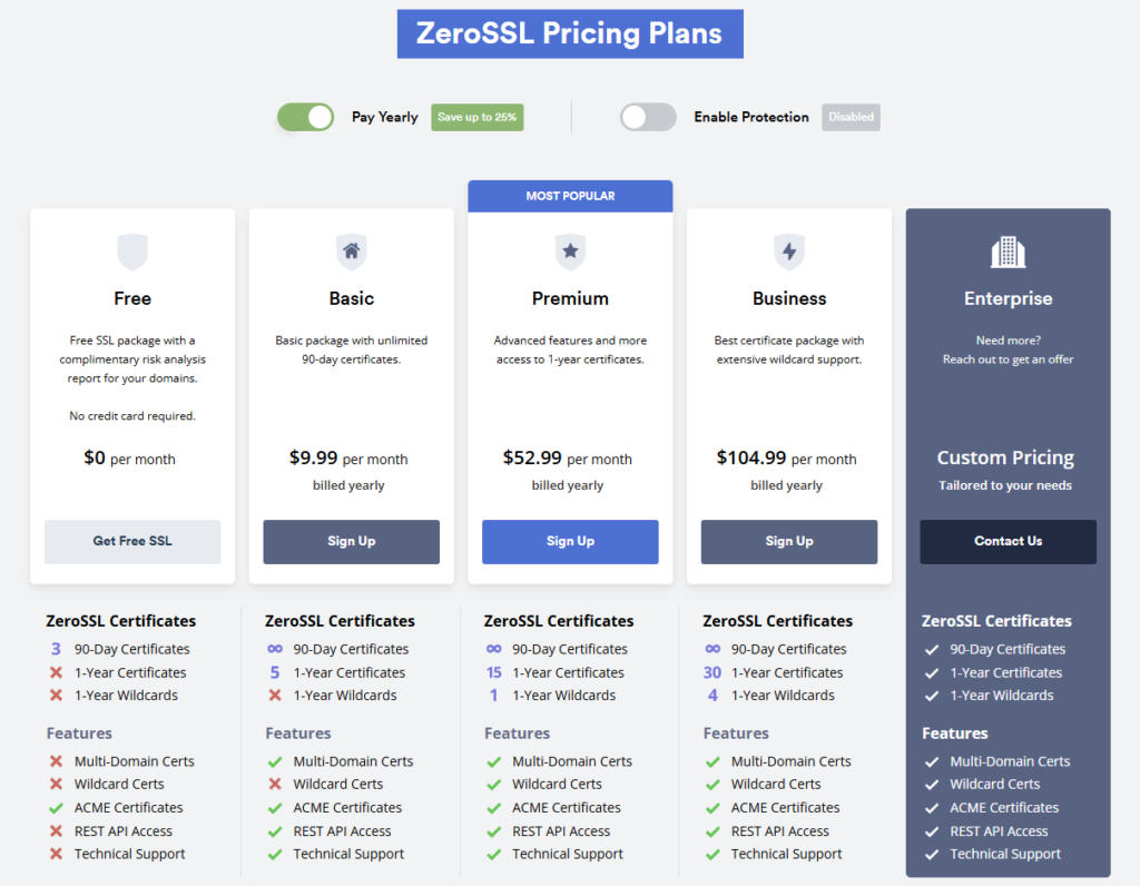 ZeroSSL is free to start—with three certificates available at no cost. Need more? Plans start at just a few dollars per month, giving you access to wildcard certificates, unlimited renewals, and priority support.